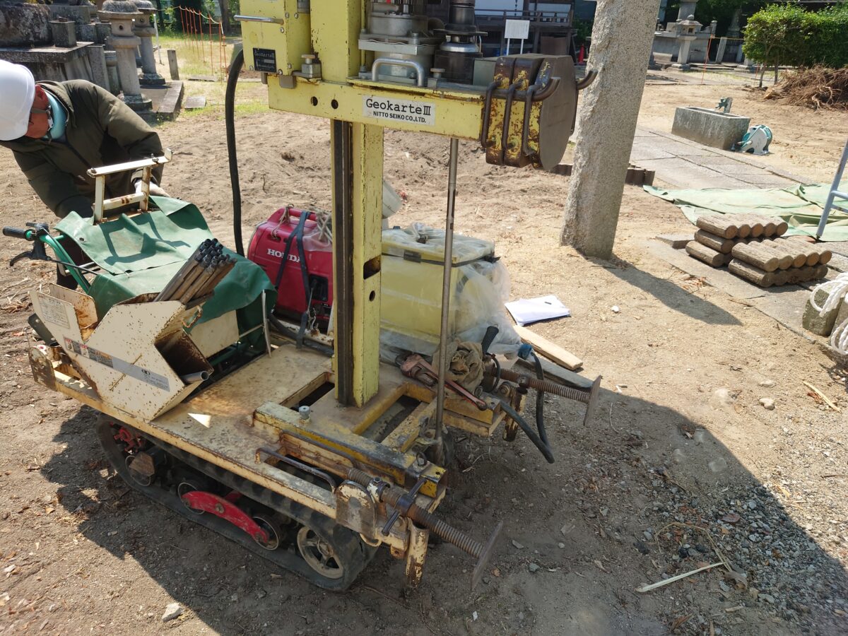 基礎工事は、まず地盤調査から始まりました。功績碑を長く安定して支えるために欠かせない、大切な工程です。調査を進めると砂地の部分もありましたが、基礎に影響するほどではなく、問題なく施工できる地盤でした。