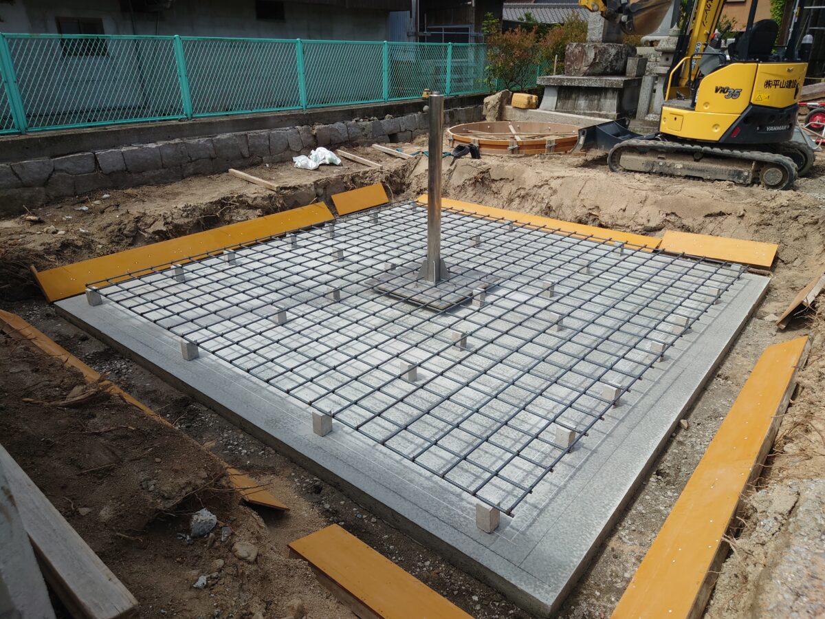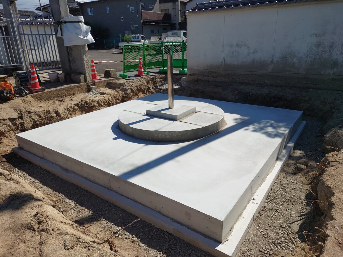 基礎の設計・施工は、物理的な根拠に基づき行われています。地盤調査の結果を踏まえて、基礎の面積を広めにとり、功績碑の重さをしっかり分散させるようにしています。使用するコンクリートは、一般の住宅基礎よりやや強い高強度コンクリート(Fc27)。圧縮に強くなるよう設計されているため、基礎自体の耐久性が高まります。さらに、内部の鉄筋を守るために、通常より厚めの保護層(かぶり厚)も確保しました。これにより、鉄筋の腐食リスクを抑え、長期にわたって安心してご使用いただける構造になっています。
